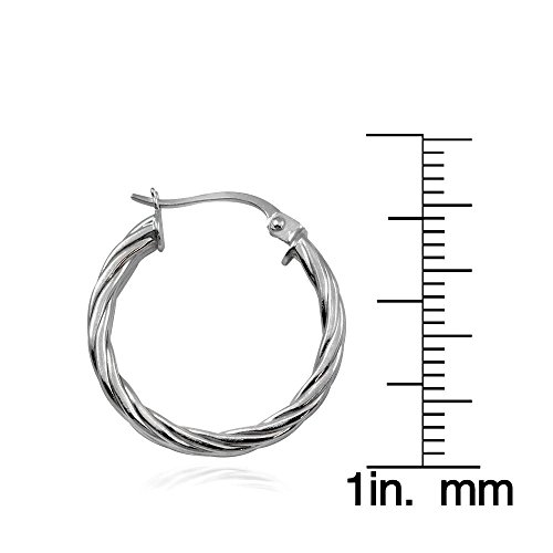 These earrings feature sterling silver high polished twist-design round hoops. They are 20mm in diameter.