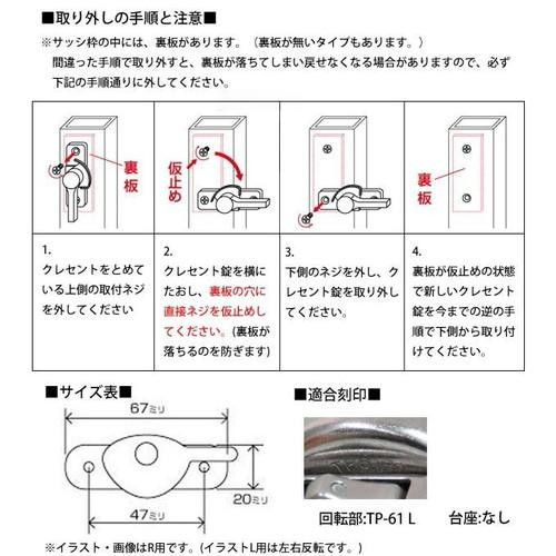 fk094igrjs窓の鍵を交換しましょう サイズ 個装サイズ:12×6×3cm 重量 個装重量:75g 素材・材質 亜鉛ダイカスト 仕様 手前右窓取付け用 ●適合刻印 回転部:TP-61 L 台座:なし 製造国 日本 サッシ用金具シリーズ 窓の鍵を交換しましょう