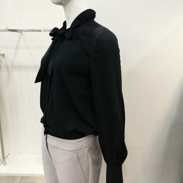 목부분 프릴로 되어있고 리본으로 맬 수 있게 나와 여성스러우며 세련되었다.