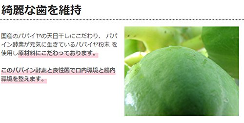 原材料:パパイヤ粉末、ナチュラルチーズ、乳酸菌、ビフィズス菌、納豆菌、植物性酵素、オリゴ糖、アロエベラ、海草、ローヤルゼリー、コエンザイムQ10