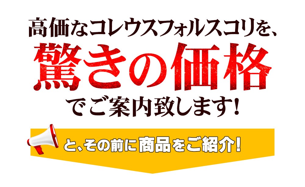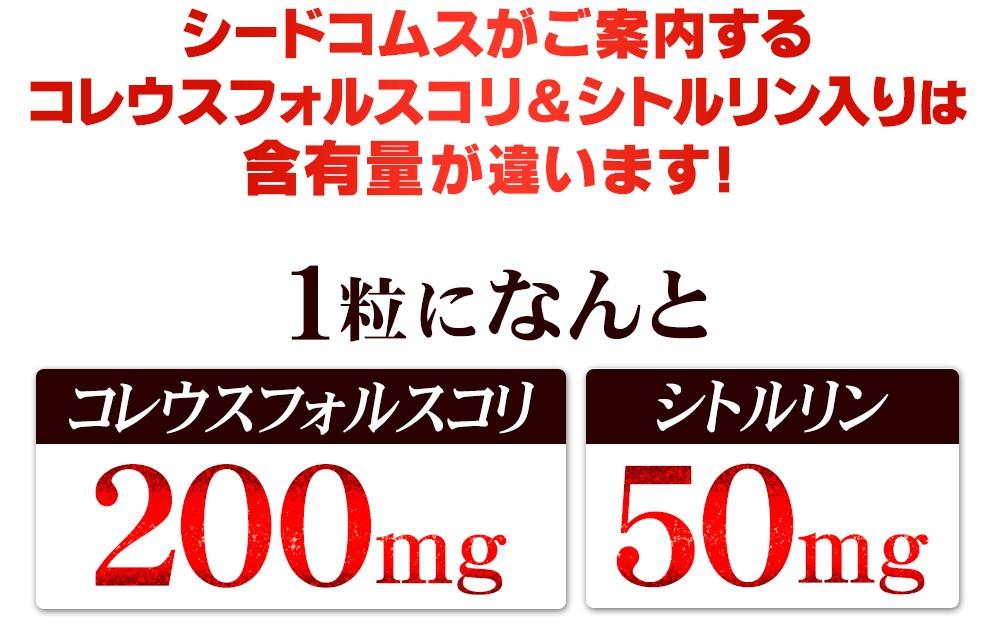 | 原材料 | コレウスフォルスコリ抽出物(難消化性デキストリン、コレウスフォルスコリ抽出物)、L-シトルリン、結晶セルロース、ステアリン酸カルシウム、二酸化ケイ素