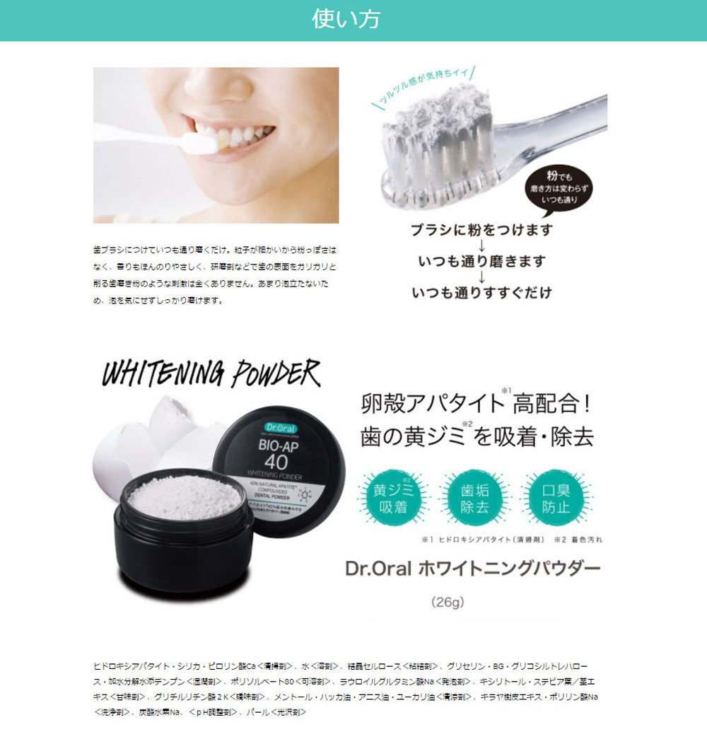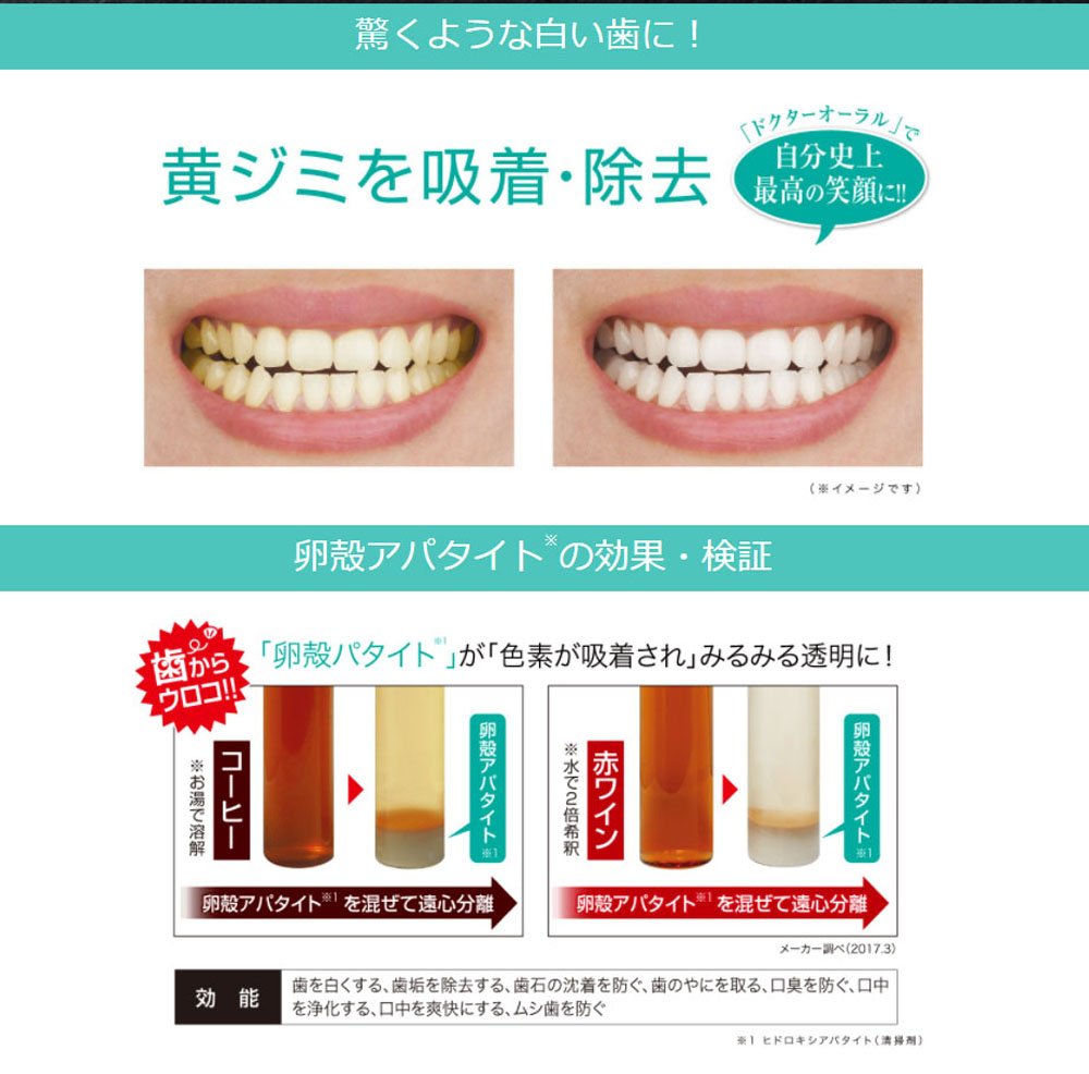 Dr. Oral Whitening Powder is a powder toothpaste of whitening care which blended 40% as much as the industry's "eggshell apatite", which is the industry's first egg leaf to realize dirt falling without burdening the tooth.