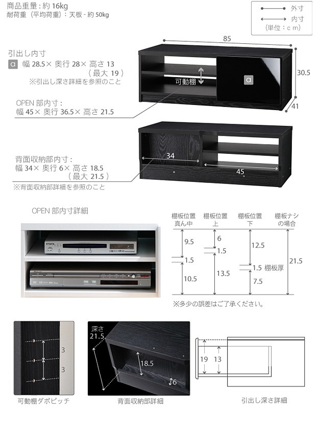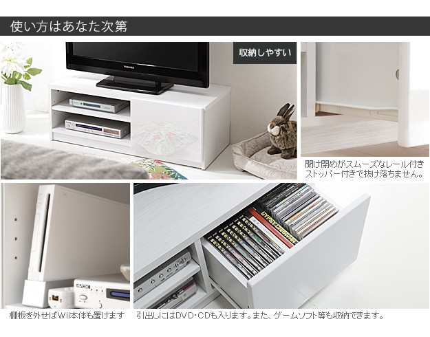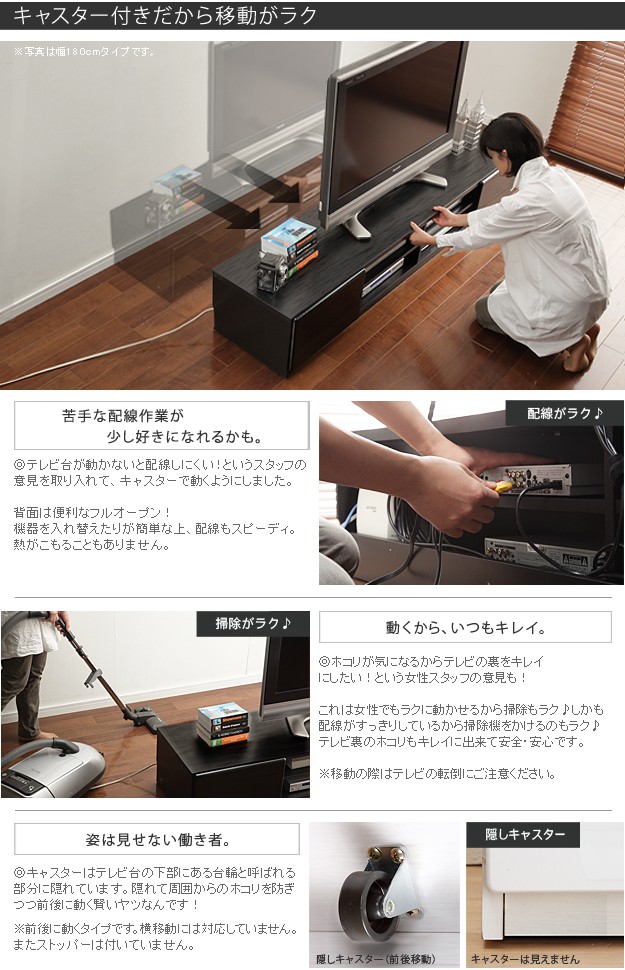 ●商品について:背面収納タイプのTVボード。一人暮らしのお部屋や小型テレビにおすすめの省スペースサイズです。小さくても背面のコード収納スペースやレール引出し、オープン棚(可動棚板1枚)、隠しキャスター付きなど機能はとっても充実。天板耐荷重は約50kg(引出し・棚は各約5kg)です。