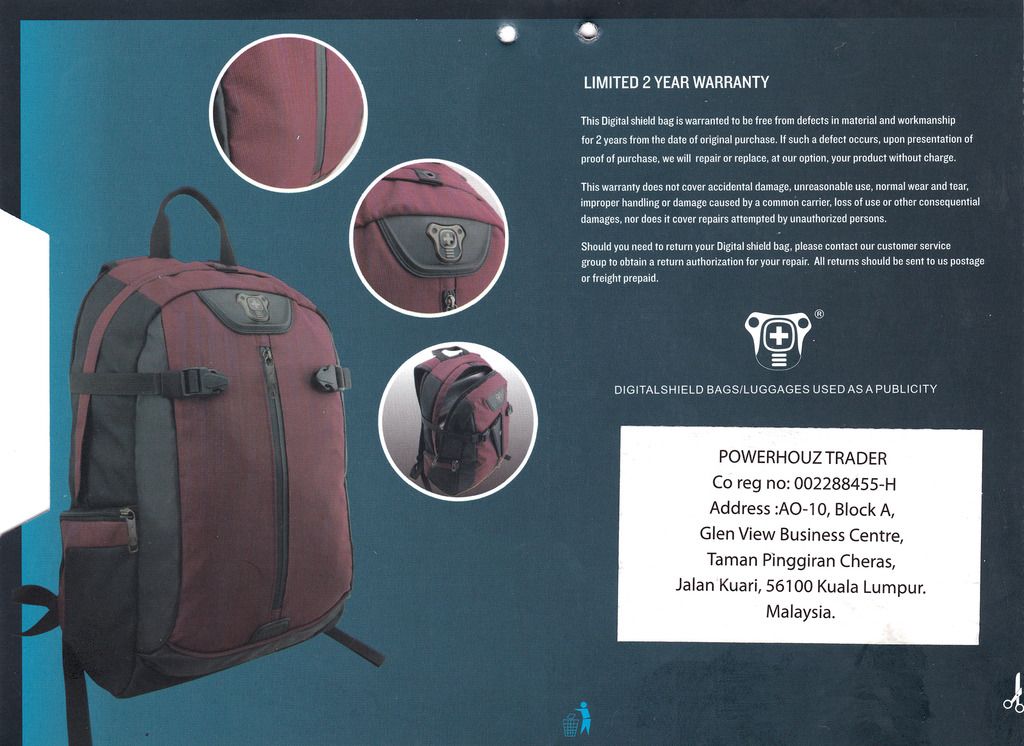 This Digital Shield bag is warranted to be free from defects in material and workmanship for 2 years from the date original purchase. If such a defect occurs, upon presentation of proof of purchase, we will repair or replace, at our opinion, your product without charge. This warranty does not cover accidental damage, unreasonable use, normal wear and tear, improper handling or damage cause by a common carrier, loss of use or other consequential damages, nor does it cover repairs attempted by authorised persons. Should you need to return your Digital Shield bag, please contact Malaysia Distributor to obtain a return authorisation for your repair. All returns should be send to us postage or freight prepaid.