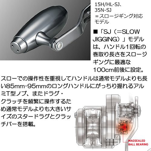 「SJ(=SLOW JIGGING)」모델은,핸들1회전 권잡기 길이를 슬로우 지깅으로 최적인 100cm전후에 설정.슬로우 에서의 조작성을 중시해 핸들은 통상 모델보다(부터)도 긴 85mm-95mm의 롱 핸들에 다부지게 쥘 수 있는 알루미늄T형 노브,또한 드래그 클러치를 빈번하게 조작 하기 위해(때문에) 통상 모델보다(부터)도 크다크기의 StarDrag 와 클러치 바를 탑재.