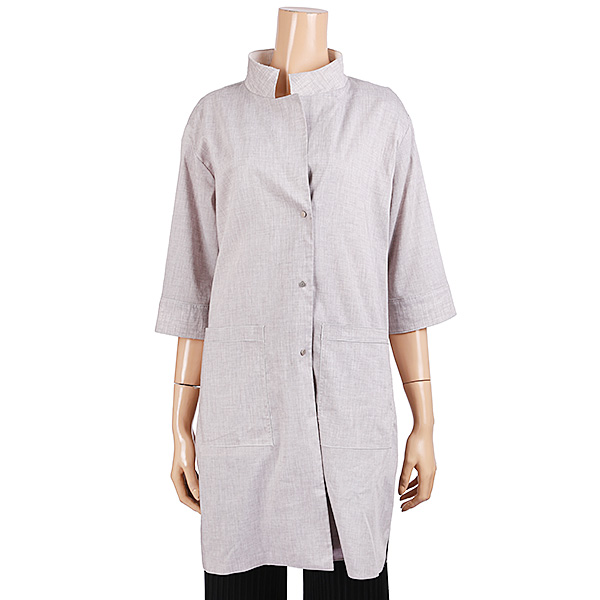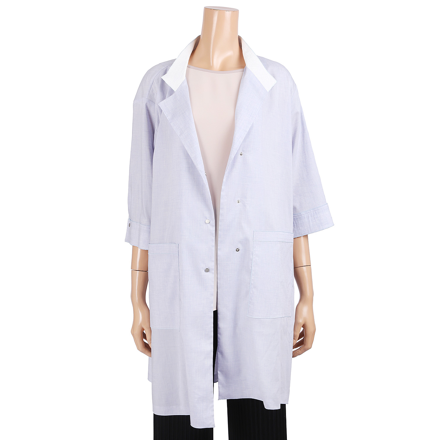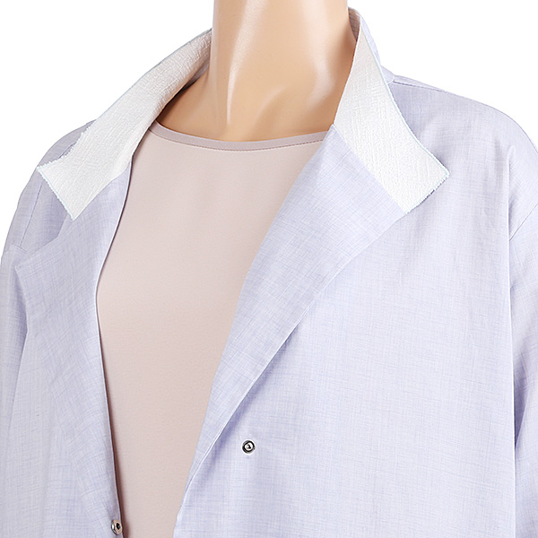 이제품의카라는 기본카라와 차이나카라로 입을 수 있으며 7부기장의소매와 카우스의 투톤색상과 테이핑의포인트