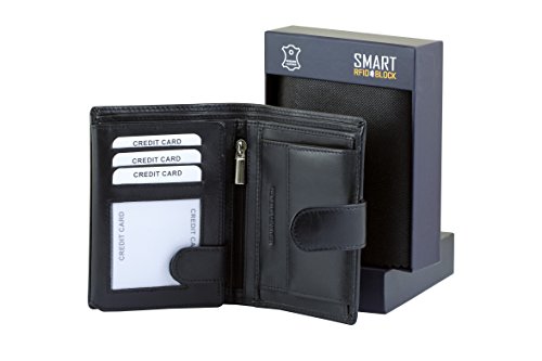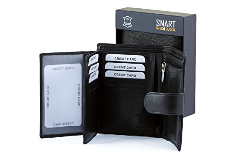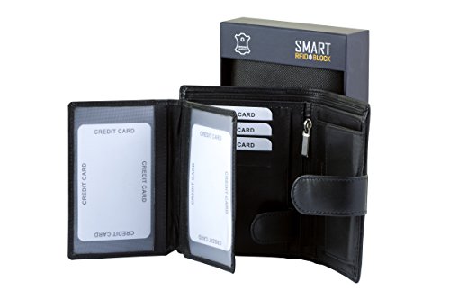 -. Feature : ✔ Sicher und komfortabel: RFID- und NFC-blockierendes Innenfutter, bietet wirksamen Schutz vor Datendieben, sichert Ihre Pässe, Kreditkarten, EC-Karten und alles, was einen RFID- oder NFC-Funkchip hat, vor dem ungewollten Auslesen - einfach die Börse zuklappen und Hacker haben keine Chance. Im aufgeklappten Zustand können Zugangskarten etc. weiter genutzt werden, ohne sie aus der Börse nehmen zu müssen! Nähere Hinweise siehe Beschreibung unten. / ✔ Super Qualität: weiches, naturbelassenes Rindsleder in schwarz, hochwertige Verarbeitung, / ✔ Viel Platz: 11 Kreditkartenfächer (davon 1 durchsichtig), 2 Ausweisfächer, 2 große Einsteckfächer, Reißverschluss-Doppelfach, unterteiltes Geldscheinfach, Hartgeldfach aus Vollleder, Maße: ca. 9,5 x 12,5 x 2 cm, Gewicht 123 Gramm. / ✔ Ideal verpackt in einer attraktiven Geschenkbox für das perfekte Geschenk. / ✔ RFID Schutz TÜV- geprüft un zertifieziert.