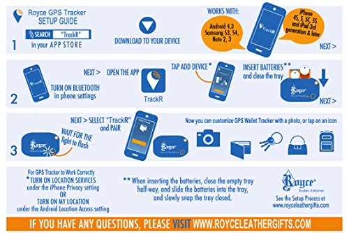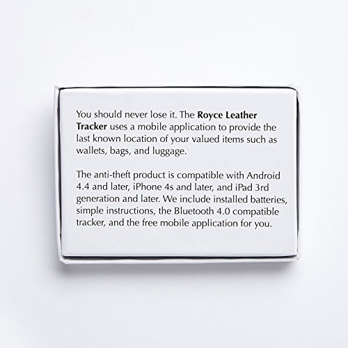 Studio : Royce Leather Publisher : Royce Leather Product Description The Royce Leather Tracker uses a mobile application to provide the last known location of your valued items such as wallets, bags, and luggage. The anti-theft product is compatible with Android 4.4 and later, iPhone 5 and later, and iPad 3rdgeneration and later. We include already installed batteries, simple instructions, the Bluetooth 4.0 compatible tracker, and the free mobile application for you. 0
