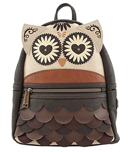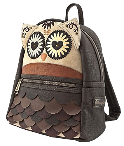 This adorable mini backpack features a full front owl detailing on PU leather along with cute ears, eyes, and feather details. Dual reinforced padded shoulder straps, top handle, front exterior zipped pocket, two side exterior pockets, fully lined interior, and top zip closure.Feature