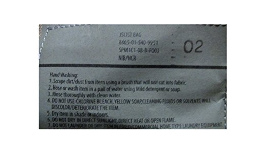 -. Feature : NSN 8465-01-540-9951 /MOLLE compatible / JSLIST: Joint Service Lightweight Integrated Suit Technology / Bag/Pack only ~ no contents included / Approx. size/flat: 16" Tall x 17" Wide x 8" Depth w/side pocket on each side / Cordura Denier Fabric w/ Camo Front & Waterproofed Back
