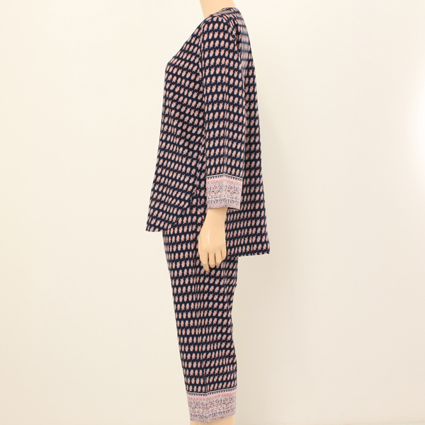 기하학 보더 프린트가 에스닉하면서 트렌디하며 소매 단, 바지에 포인트로 보더가 있는 파자마입니다.뒷밑단이 앞밑 단보다 길어서 캐주얼하며 멋스럽게 착용 가능하며,품이 넉넉해서 착용감이 뛰어나며 레이온 원단이 부드러 운 제품입니다.