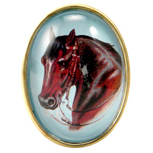 -. Feature : Elegant Vintage Illustrated Horse Cameo Jewelry Framed in a Simple Brass. / Made in the USA. Each piece is designed and created by artisans in a small New Jersey studio. / Lovely Image is enhanced by a clear acrylic magnifying cabochon set in brass with a gold plated pin back. / Oval Pin measures 30x40 mm.