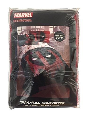 Transform any child's bedroom with a bold MARVEL Deadpool invasion reversible twin/full comforter. Sure to keep you warm, this reversible comforter is stuffed with polyester fill for loft and cozy comfort. Quilt stitching holds durable polyster fill in place and adds decorative flair. Durable polyester fill is soft, comfy and warm and holds its shape after multiple washings. Reversible design allows you to instantly change the look by simply flipping the comforter over. Twin/full comforter measures 72" x 86". additional bedding coordinates and accessories sold separately on this page. Easy care, machine washable. ImportedFeature