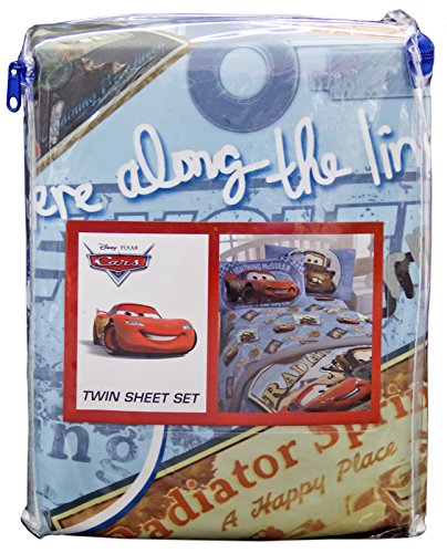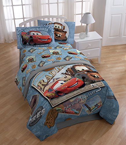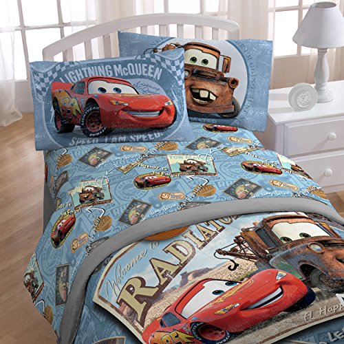 Get ready for the race tracks with this Cars Tune Up full sheet set featuring the super fast one-of-a-kind racecar Lightning McQueen. Each 4 piece, super soft microfiber full sheet set includes a fitted sheet, flat sheet and two standard reversible pillowcases. The bold colors and exciting design will enhance the existing décor of any kid's or toddler bedroom. Fitted sheet measures 54" x 75", flat sheet measures 81" x 96" with two 20" x 30" standard pillowcases. Decorative bedding features popular characters and icons from the movie. 100% polyester. Easy care, machine wash cold, tumble dry low. ImportedFeature