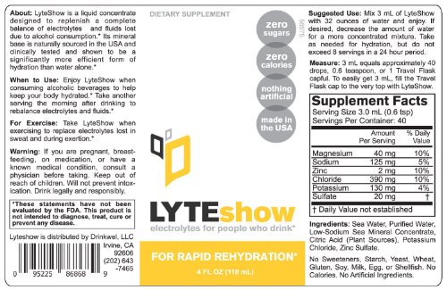 -. Binding : Health and Beauty -. Brand : drinkwel -. Feature : The Smarter Way to (Re)Hydrate! Each 4 ounce bottle contains 40 servings of LyteShow concentrate. Depending on usage, each bottle lasts approximately 2-6 weeks. Ingredients include balanced ions of magnesium, sodium, chloride, potassium, and trace minerals. Also contains zinc, an essential trace element, and citric acid. / Adds a slightly tart and salty flavor to water. This is a functional, health-focused product. If you prefer blue berry blast (or other artificial flavors), we sest you look elsewhere! If you're sensitive to the mineral flavor, we recommend adding a squeeze of lemon or splash of juice. / Perfect for adding to hydration packs or water bottles, as it will not leave a residue or contribute to the growth of mold or bacteria. / Contains no calories, sugars, sweeteners, carbohydrates, artificial colors, flavors, or preservatives. Non-GMO, vegan, vegetarian, and gluten free. Naturally sourced mineral base from the Great Salt Lake in Utah. Manufactured in an FDA-regulated and NSF GMP-certified facility. We guarantee you will feel healthier and rehydrated or receive all of your money back, including shipping. (No need to send the product back. No forms to fill out. No BS. We're just a company that stands behind our product.) / How Does LyteShow Compare To Sports Drinks? Not only do most sports drinks contain calories, sweeteners, and artificial additives, they often only include one or two types of electrolytes (usually sodium and/or potassium). LyteShow puts a lower emphasis on sodium - readily available in the American diet - and emphasizes magnesium, an essential electrolyte which is often omitted from sports drinks because it is more expensive. Magnesium is critical for all energy conversion, muscle function, and nerve conduction and also assists other electrolytes in arriving at the proper place and function. We take great pride in our balanced formula of magnesium, sodium, chloride, potassium, and naturally occurring trace minerals. -. Label : Drinkwel -. Manufacturer : Drinkwel -. MPN : Drinkwel_Parent -. PartNumber : Drinkwel_Parent -. ProductGroup : Health and Beauty -. ProductTypeName : HEALTH_PERSONAL_CARE -. Publisher : Drinkwel -. Studio : Drinkwel -. Title : LyteShow - Electrolyte Concentrate for Rapid Rehydration - 40 Servings (With Magnesium, Potassium, Zinc)