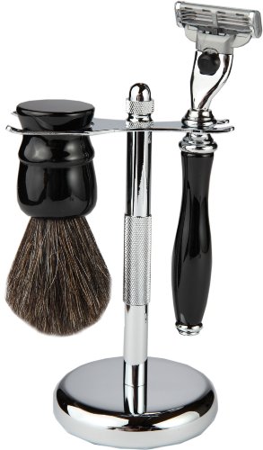 3 Piece Shaving Set With Mach 3 Heavyweight Handle, 100% Badger Brush, With All metal Textured Chrome Classy Stand (Matching Black)