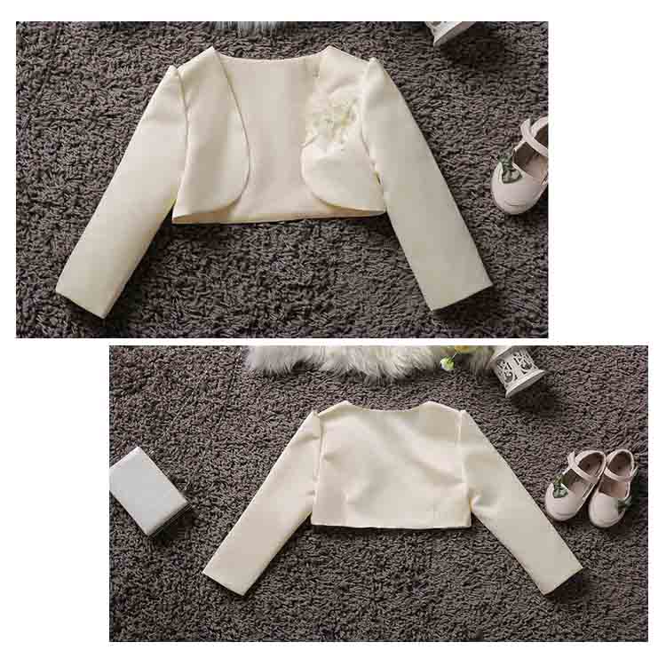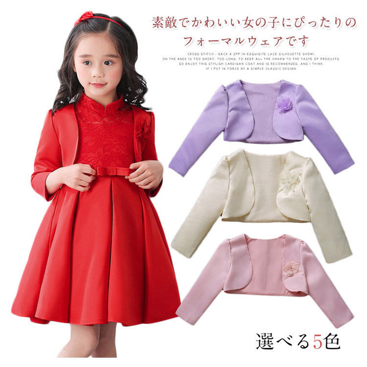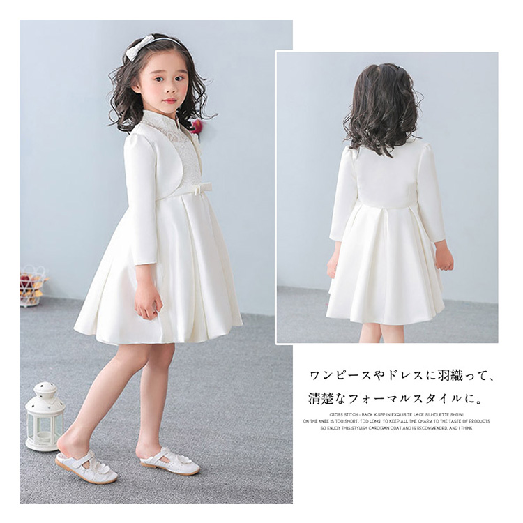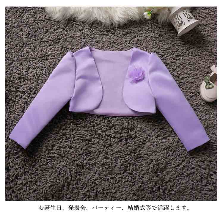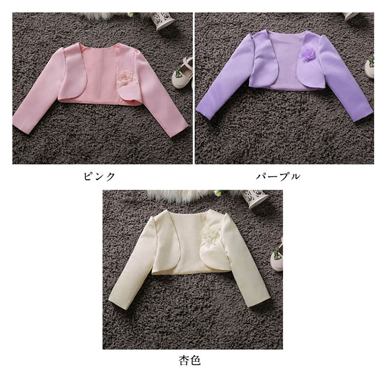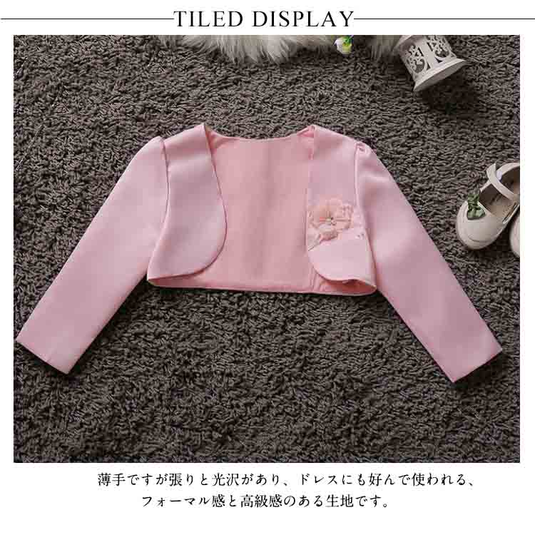 | 素敵でかわいい女の子にぴったりのフォーマルウェアですワンピースやドレスに羽織って、清楚なフォーマルスタイルに。 薄手ですが張りと光沢があり、ドレスにも好んで使われる、フォーマル感と高級感のある生地です。お誕生日、発表会、パーティー、結婚式等で活躍します。 | |
