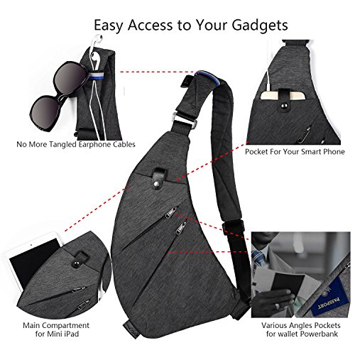 -. Feature : ►Small Lightweight Sling Backpack - Form fitting design one strap over shoulder sling backpack bag, is prefect for business, outdoor hiking, gym, fishing, camping, climbing, riding, driving, outings, traveling, working, school, dating, shopping in casual daily life / ►Comfortable and Durable Chest Bag - 1).Extended adjustable strap (35 to 50 inch), fits most regular and plus-size person. 2). Carry on right shoulder, bag on your left side, easy access. 3).Mini backpack purse uses branded quality SBS zippers and comfortable polyester fabric, precise stitching make it durable / ►Crossbody Sling Bags Compartment - 1*main zipper pocket (fits up to a 7.9 inch iPad mini), 1* magnetic snap phone pocket, 2* front zipper pockets, 1*small inner zipper pocket (RFID Blocking, protect your credit cards, ID card and personal information against identity theft,but will not block phone signal) / ►Mini Organized Sling Back Pack - Multiple pockets at various angles, easy access to all your gadgets (such as smart phone, earphone, tablet, passport holder, wallet, keys, power bank, charging cable) / ►What You Get - Chest Sling Bag with pouch, 30 days 100% satisfaction guarantee warranty and friendly customer service