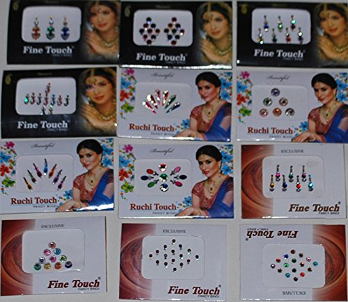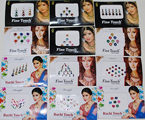 -. Binding : Misc. -. Brand : Wevez -. Color : Mix Assorted Colors and Designs -. Feature : Pack of 12 Bindi Strips (You can get random and assorted Bindi which can be different from picture) / Each Strip contains 3 to 16 Bindi (We keep updating Bindi Designs) / Single bindi can be used many times (Easy to stick, you can place bindi back on packing strip to use it again) / Great Gift Idea for Bollywood and Belly Dance Theme Party / Can be worn on forehead / belly button / arm / nose pin -. IsAdultProduct : 0 -. Label : Fine Touch -. Manufacturer : Fine Touch -. Model : bindiset12 -. MPN : bindiset12 -. PackageQuantity : 12 -. PartNumber : bindiset12 -. ProductGroup : Beauty -. ProductTypeName : BEAUTY -. Publisher : Fine Touch -. Studio : Fine Touch -. Title : 12 Gold ,Silver, Multi Color Bollywood Head Bindi Tattoo Body Glitter