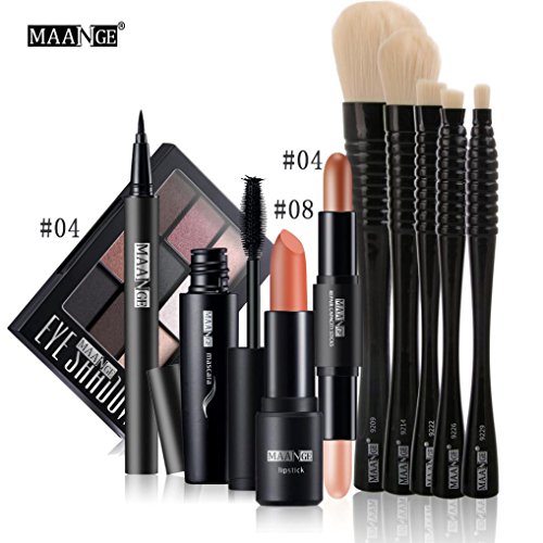 -. Title : vmree 10 PCS 1X Matte lipstick/ 1X black eyeliner pen/ 1X thick black mascara/ 1X Double-headed high-light concealer/ 1X Symphony nine color eye shadow/ 5X makeup brush Comstic Set
