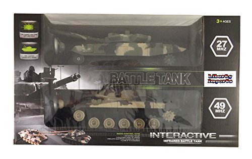 - Feature : Set of 2 Infrared Remote Control Battle Tanks with realistic lights and sounds! / Turret Can Turn Left/Right; Cannon Moves Up and Down / Aim & fire at the other tank! 4 LED Indicators for your "Lives" / Can "fire" using Canon or Machine Gun Turret! / Includes 2 rechargeable battery packs, 2 chargers, and 2 "9V" batteries