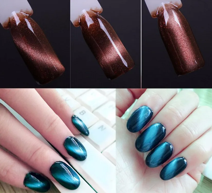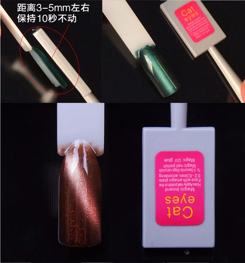 After applying the layer of cat eye gel polish, Put the magnet over the nails for 10-15 seconds to get the cat eye effect,