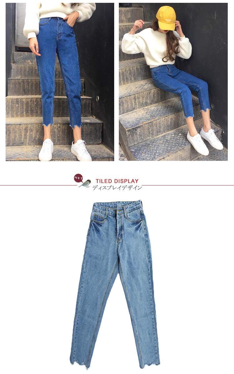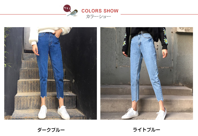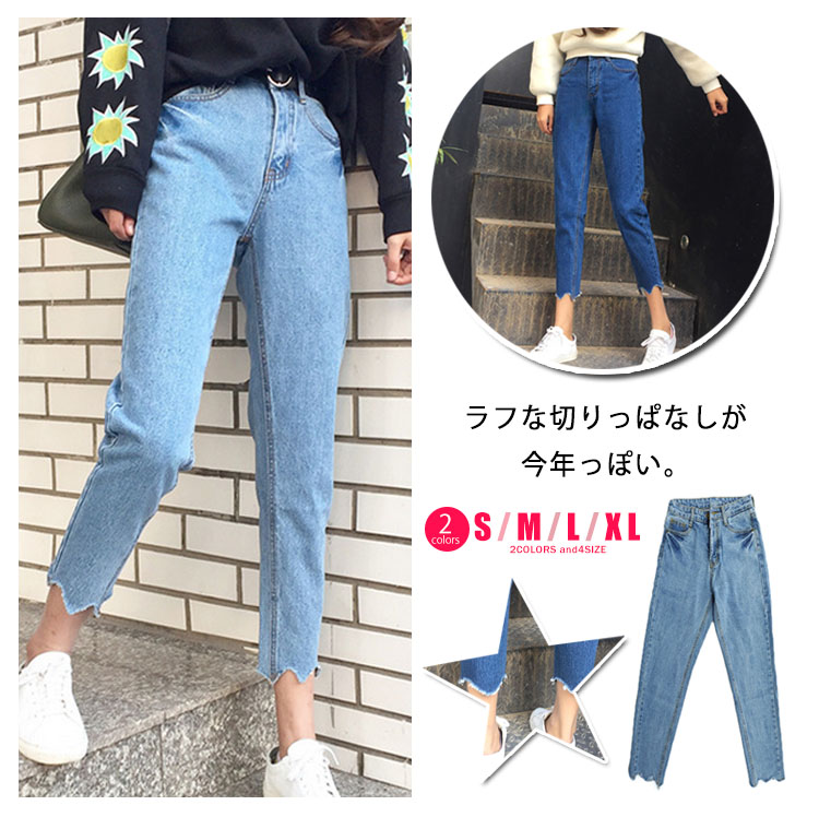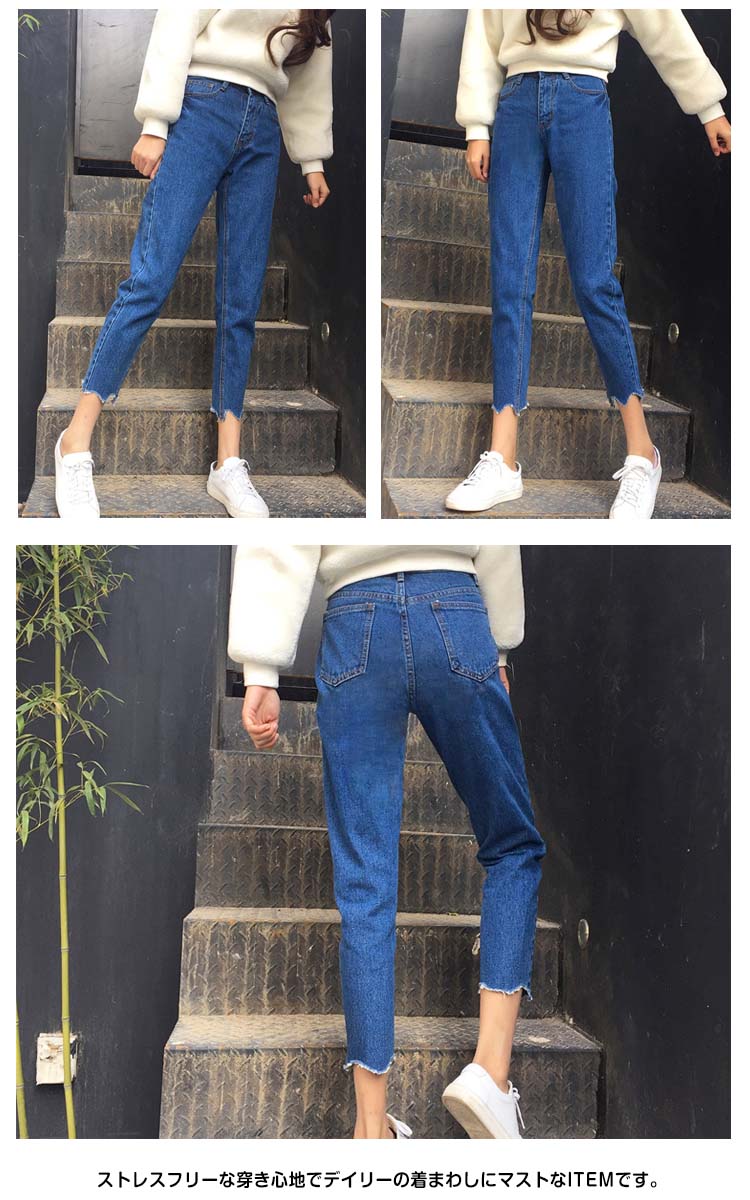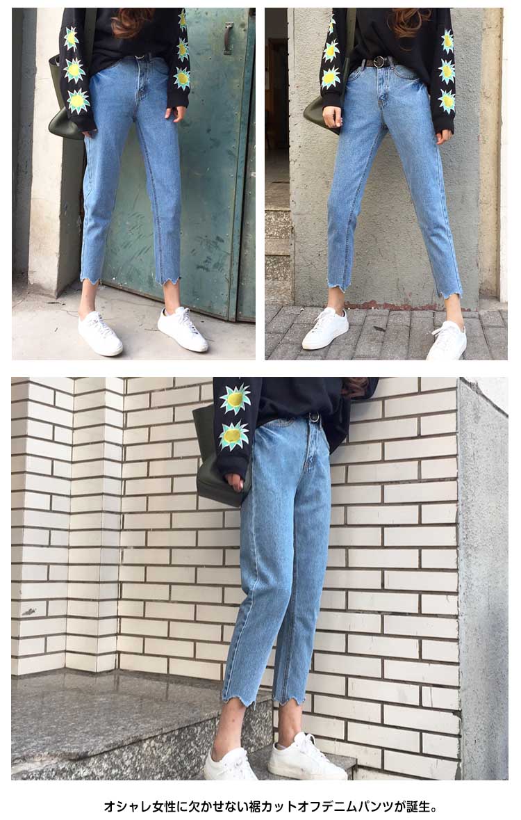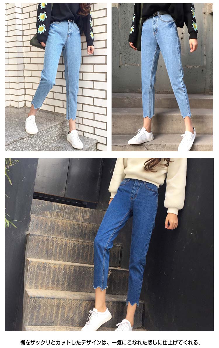 | ラフな切りっぱなしが今年っぽい。オシャレ女性に欠かせない裾カットオフデニムパンツが誕生。裾をザックリとカットしたデザインは、一気にこなれた感じに仕上げてくれる。ストレスフリーな穿き心地でデイリーの着まわしにマストなITEMです。 | |