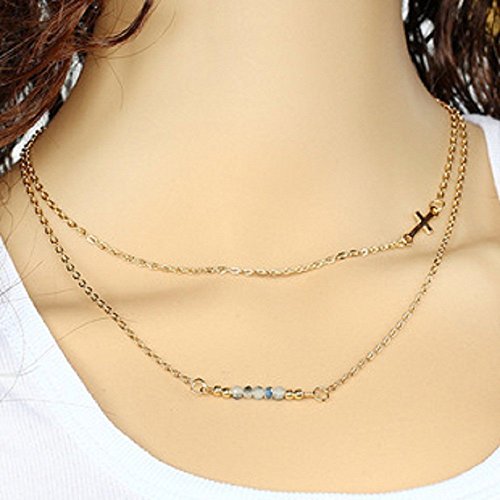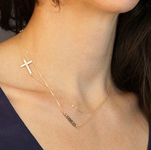 Leiothrix Simple Double-deck Cross & Beads Golden Alloy Necklace for Women and Girls Apply to Weeding Party Casual