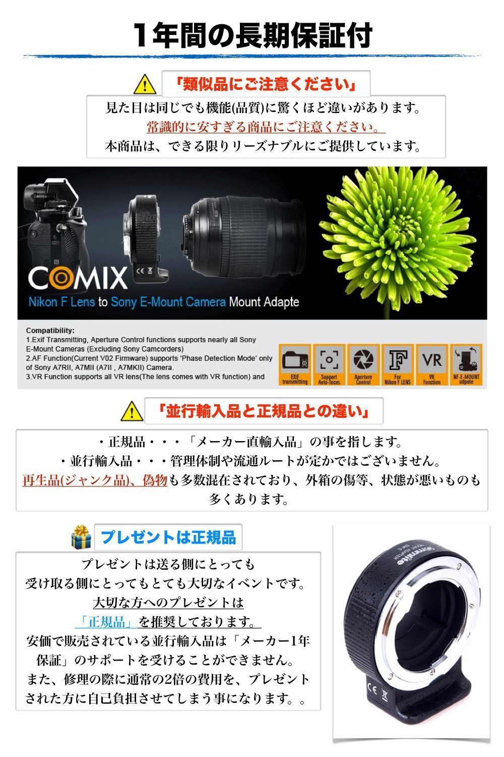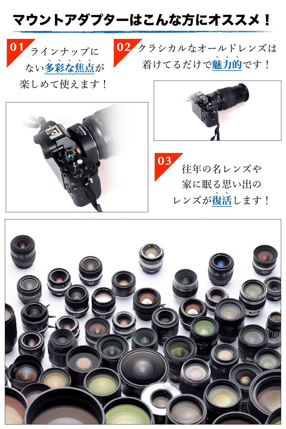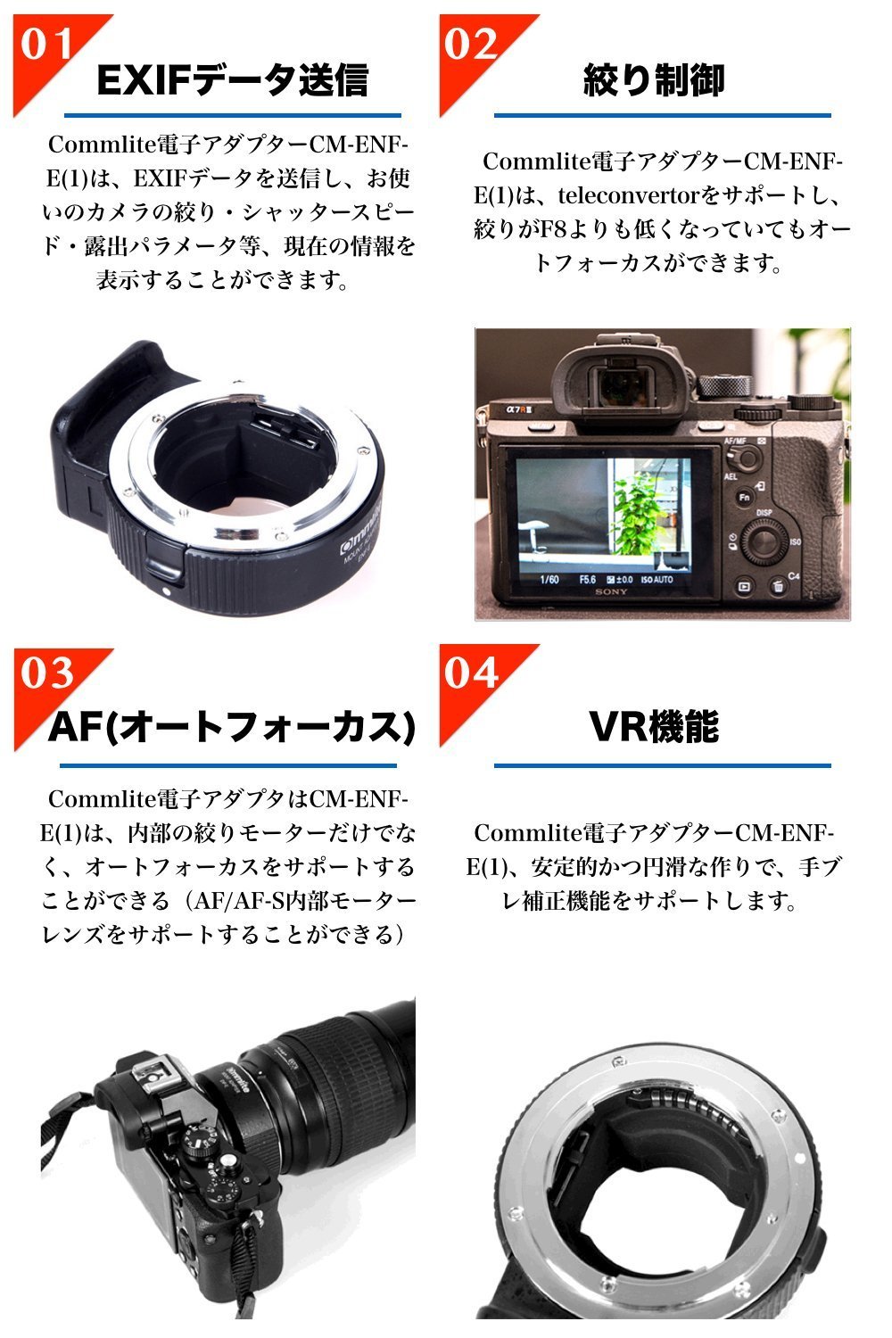 The Commlite electronic mount adapter CM-ENF-E (1) is compatible with Sony E mount camera / video camera and Nikon F lens by double-sided electronic signal transmission based on the mount adapter and realizes the following functions.