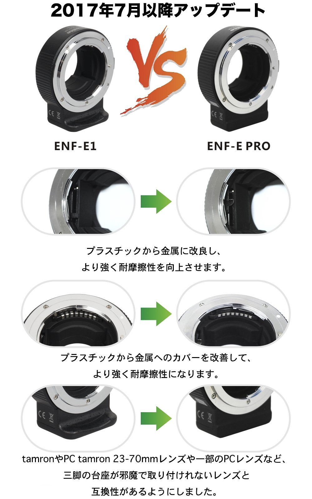 The Commlite electronic mount adapter CM - ENF - E (1) uses an aluminum alloy material that is strong and durable and does not deform even when used repeatedly.