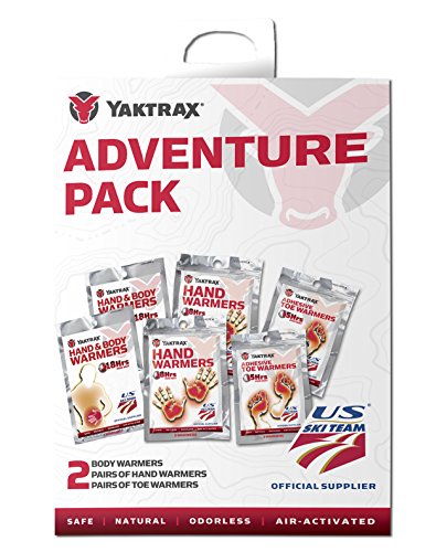 Studio : Yaktrax Publisher : Yaktrax Binding : Sports Product Description Yaktrax Hand Warmer, Body Warmer, and Toe Warmer Adventure Pack disposable warmers provides long-lasting warmth and is ideal for keeping your body warm when the temperature gets cold. Once opened, these odorless and environmentally-safe warmers begin working within minutes. Yaktrax Warmers contain natural ingredients including iron powder, water, salt, activated charcoal, and vermiculite. Yaktrax Body Warmers are ideal for keeping warm when camping, hunting, fishing, skiing, athletic events, and more. Pack includes: two pairs Hand and Body Warmers, two pairs Hand Warmers, two pairs Adhesive Toe Warmers 0