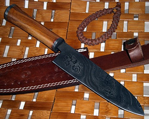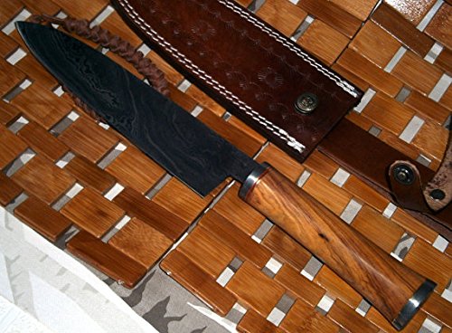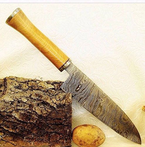 RK -11 Handmade Damascus Steel Chef Knife. Olive Wood Handle, Damascus Steel Bolsters and Pommel Handmade Leather Sheath included. Handle Length : 5:00 Inches Blade Length : 07:50 Inches Over all Length : 12:50 Inches BLADE The blade is Made By 1095/15N20 ALLOY STEELS (176 true Layers) Hand forged to Beautiful Pattern. Damascus steel of this knife has high quality contents to give an excellent edge and sharp cutting abilities. Hardness of the blade of this knife is HRC 57-60 in the lab & been hand sharpened to a Sharp Edge. BUYING You must be sure and certify that you are 18+ of age and you are able to legally purchase and own an item and will use it responsibly.