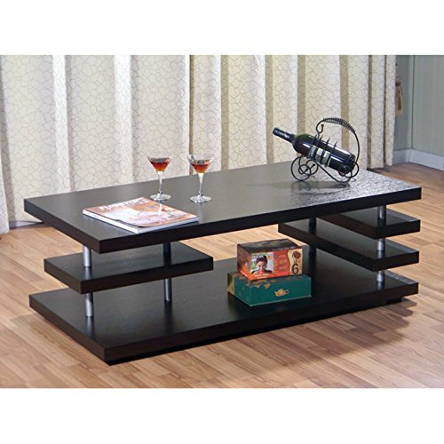 - Feature : Multi-tiered shelving / Mixed MDF and wood veneer construction / Rich cappuccino finish / Rectangular top panel / Dimensions: 47L x 23W x 15H inches