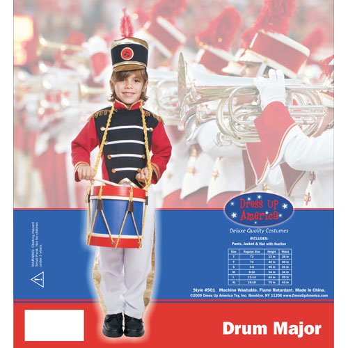-. Brand : Dress Up America -. Color : Multi -. Department : baby-boys -. Feature : ► Product comes complete with: Jacket with Epaulets, Pants and Hat with Feather / ► Jacket features real buttons, epaulets, stand-up collar and has back zipper closure / ► Made with 100% Polyester Featuring: resistant to most chemicals, stretching and shrinking, wrinkle resistant, mildew and abrasion resistant / ► Pants have a side strip of metallic gold and an elastic waistband for comfortable fit / ► Cylinder shaped hat with plume and gold visor -. Label : Dress-up America -. Manufacturer : Dress-up America -. Model : 501 -. MPN : 501-L -. NumberOfItems : 1 -. PackageQuantity : 1 -. PartNumber : 501-L -. ProductGroup : Apparel -. ProductTypeName : BABY_COSTUME -. Publisher : Dress-up America -. Size : Large -. Studio : Dress-up America -. Title : Drum Major Toddler Costume