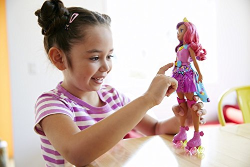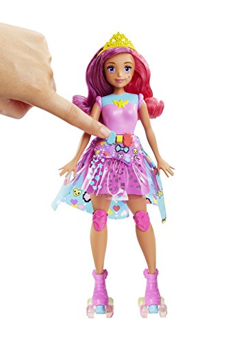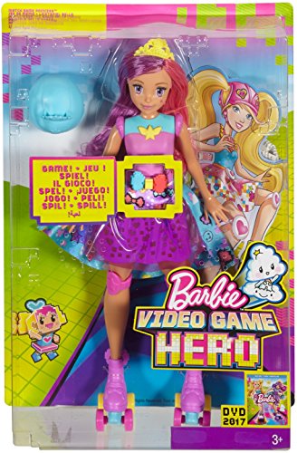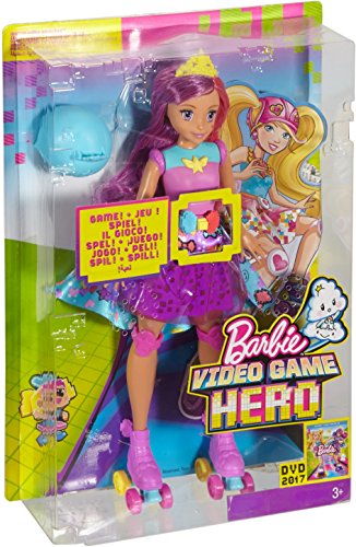 Be a game changer with Barbie doll! Test your memory with this ultra-cool Barbie Video Game Hero Match Game Princess doll inspired by the anime world in Barbie Video Game Hero. Her colorful racing look hides a fun, interactive game within its anime fashion elements. Get started with the push of a button on her belt. The doll’s purple skirt lights up with a pattern using three colored lights. Your goal is to repeat the pattern using the corresponding colorful buttons on her belt. As more patterns are successfully matched, they become more challenging -- five different levels can test different memories to the max. Barbie match game doll is also ready for fun in the physical world with purple and blue roller skates sporting wheels that really roll! She’s ready to race wearing a fun look -- a purple bodice with star graphic, her purple light-up skirt with a vinyl overlay with a blue video game-inspired detail and pink kneepads. Add to the storytelling fun with a yellow tiara and blue helmet that can be switched to accessorize her long color-blocked pink and purple locks. Young gamers will love this doll that combines interactive gaming action with roller skating! Collect all of the Barbie Video Game Hero dolls for a full cast of video gaming characters (each sold separately, subject to availability). Includes Barbie Video Game Hero Match Game Princess doll with memory game feature, roller skates with working wheels and two headpieces. Doll cannot stand or roller skate alone. Colors and decorations may vary.Feature