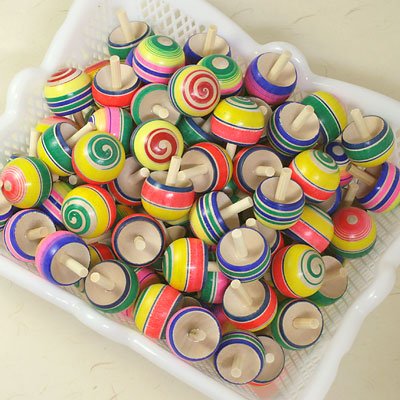 もう大量に独楽を盛ったら出来上がったセットです。もりっと盛られた独楽は100個。お子様も遊び放題回し放題です。っていうのはネタですが、子供会や文化祭など、大量に独楽を使う時のセット。皆で一緒に回して逆立ちさせて楽しんじゃいましょう。※色柄はアソートとなります。■逆立ちこま3個セット100個もいらない、3個で十分という方はこちら■サイズ:φ3 × 4 (cm)