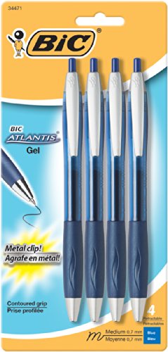 -. Binding : Office Product -. Brand : BIC -. Color : Black -. EAN : 0070330344716 -. Feature : Retractable for quick and convenient writing / Contoured rubber grip for comfort and control / Metal clip and metallic nose cone for a contemporary look / Smooth writing gel ink / 0.7 mm medium point in black, blue and red ink -. Label : BIC Corporation -. Manufacturer : BIC Corporation -. Model : RATGP41 - BLUE -. MPN : RATGP41 - BLUE -. NumberOfItems : 1 -. PackageQuantity : 4 -. PartNumber : RATGP41 - BLUE -. ProductGroup : Office Product -. ProductTypeName : WRITING_INSTRUMENT -. PublicationDate : 2012-05-15 -. Publisher : BIC Corporation -. Studio : BIC Corporation -. Title : BIC Atlantis Gel, Medium Point (0.7 mm), Blue, 4-Count -. UPC : 070330344716 -. Warranty : 100%