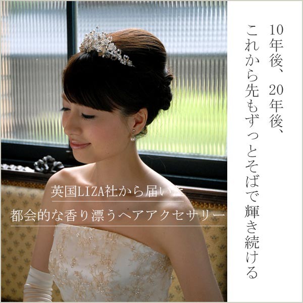 「 上品なきらめきと美しいデザイン 」 普通っぽさに飽き足らない、おしゃれな大人のアクセサリー。 ウエディングドレスのデザインにこだわらず、コーディネートしやすいティアラです。