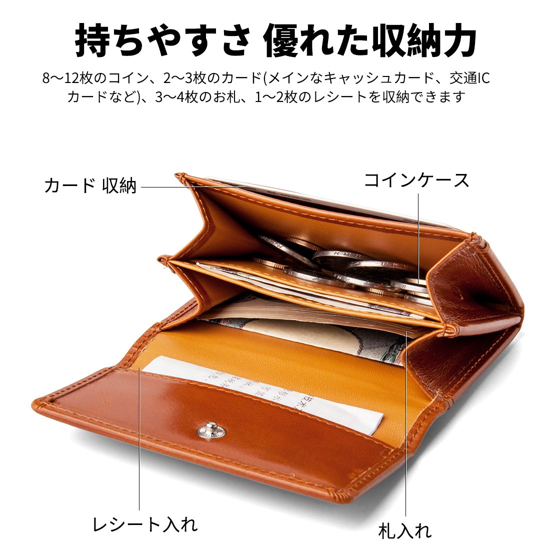 Excellent storage capacity It can store 8 to 12 coins, 2 to 3 cards (main cash card, traffic IC card, etc.), 3 to 4 bills, 1 to 2 receipts.