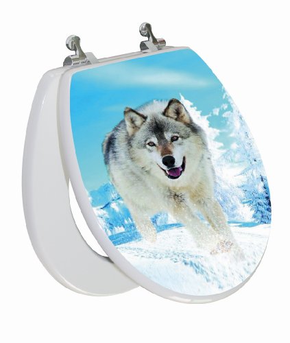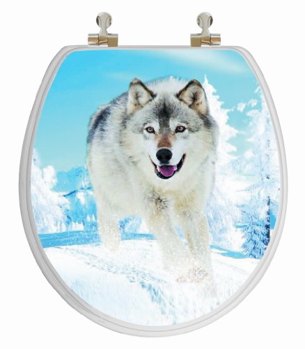 -. Feature : Life like 3D image of snow wolf in his scenic artic environment / Hand sanded, impeccably smooth, superior painted finish under lid and on ring, white / Wood composition offers comfort, warmth and durability / Sturdy chromed metal hinges that will match most bathroom fixtures / Fits round toilet bowls - See diagram - One year warranty