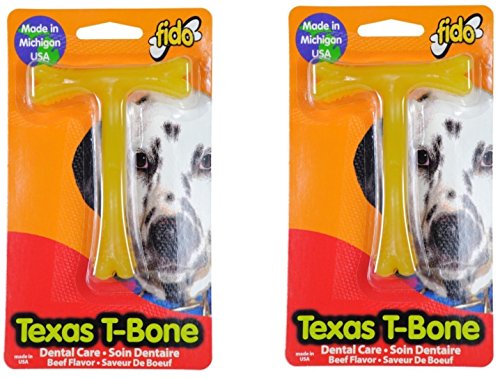 -. Binding : Misc. -. Brand : Fido -. EAN : 0638827649890 -. Feature : Pack of 2 / Texas T-Bones have long lasting beef flavor and they put up with lots of chewing. / A great toy. Soft and flexible for average chewers, older dogs and puppies. / Easy to hold and grip, gnawing massages the gums, helps fight plaque and tartar and reduces bad breath. / Utilizes a slow flavor release system. -. Label : Fido -. Manufacturer : Fido -. PackageQuantity : 1 -. ProductGroup : Pet Products -. ProductTypeName : PET_SUPPLIES -. Publisher : Fido -. Studio : Fido -. Title : (Pack of 2) Fido Texas T-Bone Dental Dog Bone, Beef Flavored Size Small 4" -. UPC : 638827649890
