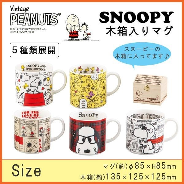 スヌーピーの可愛いイラストがデザインされた木箱に入っています。スヌーピー、ウッドストック、コミック、チェック、ロゴのデザインが描かれたカップです。プレゼント(ギフト)にもおすすめです。 |
