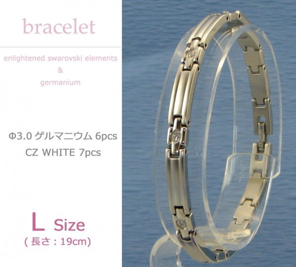 イオンプレーティング(IPメッキ)を施したミラー仕上げの純チタンブレスレットに、スワロフスキーキュービックジルコニアを7pcsと、99.99%の高純度ゲルマニウムを6pcs使用しました。様々なコーディネートに合わせやすいシンプルなデザインです♪ |