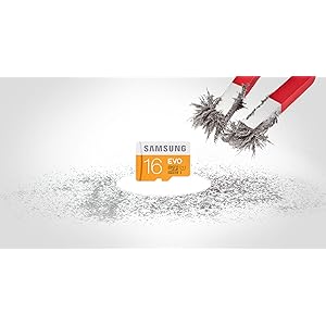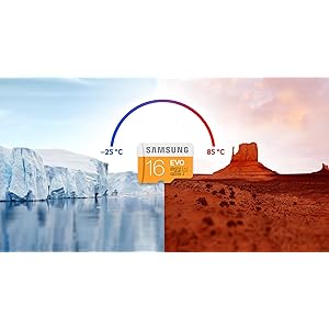 Temperature Proof Samsung EVO 16GB microSD Memory Card can endure temperatures from -25° to 85° Celsius. |