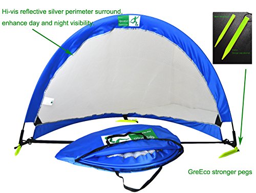 Each goal displays an innovative reflective silver perimeter surround for enhanced day and night visibility.Attached anchoring stakes (8 inches PVC pegs,stronger and longer) are included for the best stability on grass.