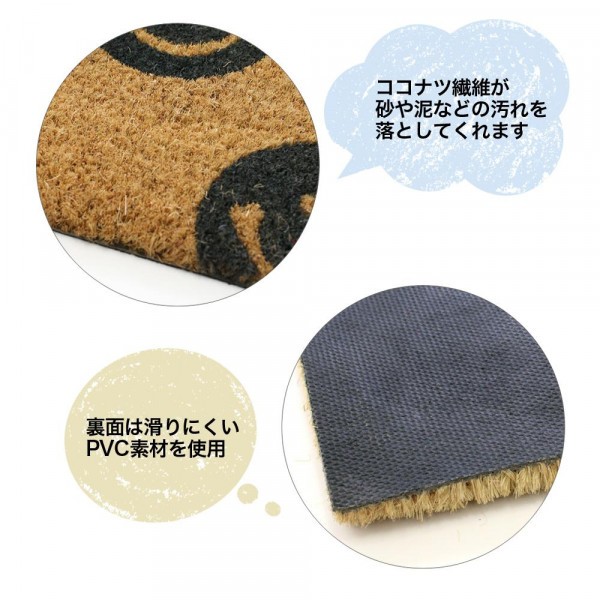 ココナッツ繊維でできた水はけのいいマットです。敷き詰められた繊維が靴の汚れを落としてくれるので、玄関やベランダなどに最適です。裏面はPVC素材を使用しているので滑りにくく、お手入れも簡単です。 |