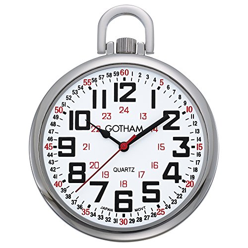 -. Binding : Watch -. Brand : Gotham -. Department : Mens -. Feature : Classic open face silver-tone pocket watch with slim polished brass case suitable for engraving / Rich white railroad style dial with black 12 and red 24 hour markers / Precision Japanese analog quartz movement / Includes matching 14" curb pocket watch chain with belt clip attachment / Arrives with deluxe draw string pouch and gift box, operating instructions and lifetime warranty card -. Label : Gotham -. Manufacturer : Gotham -. Model : 4331782407 -. MPN : GWC15029S -. PackageQuantity : 1 -. PartNumber : GWC15029S -. ProductGroup : Watch -. ProductTypeName : WATCH -. Publisher : Gotham -. Studio : Gotham -. Title : Gotham Men's Silver-Tone Slim Railroad 24 Hour Open Face Quartz Pocket Watch # GWC15029S