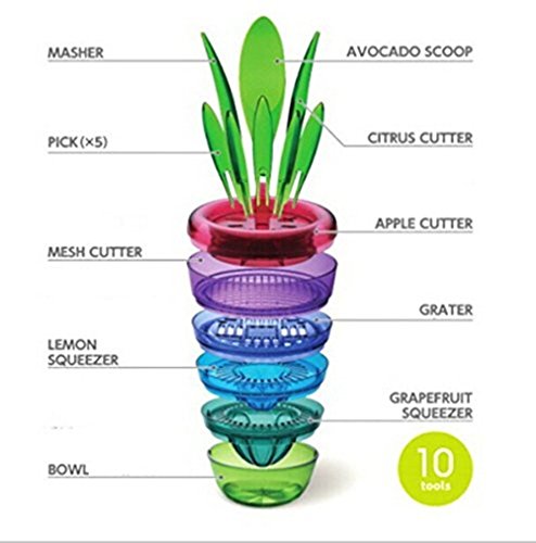-. Feature : Food grade PP material, environmental health, combining similar to a flower pot, in fact, 10 in 1 fruit cutter / Package content: 1 * masher; 1 * apple cutter; 1 * avocado scoop; 1 * citrus cutter; 1 * mesh cutter; 1 * lemon squeezer; 1 * bowl; 1 * grater; 1 * grapefruite squeezer; 5 * picks / Juicer angular, sharp not to hurt the hand, juicing faster and better, well preserved fruit nutritional value / Product Size: 240*140mm / Home essentials, Mom essentials, Perfect gift