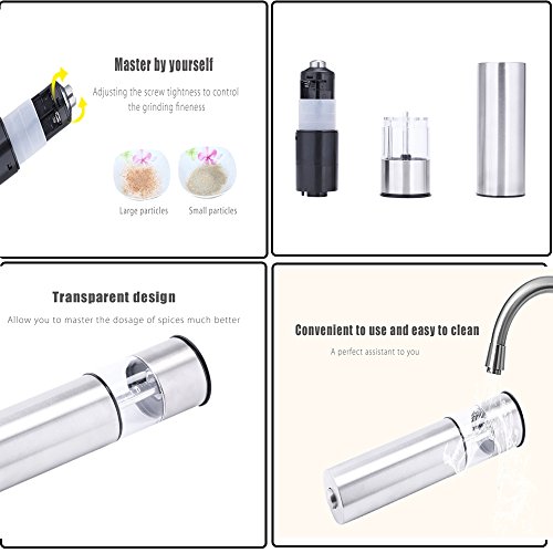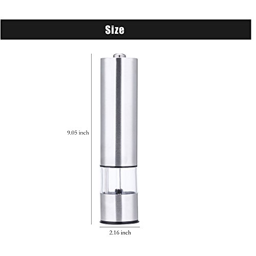 Features: - Electric pepper spice grinder, ideal for milling pepper and other small sized spices - Transparent design: allows you to master the dosage of spices much better - Convenient to use and easy to clean: a perfect assistant to you - Adjusting the screw tightness to control the grinding fineness - Adopts finest acrylic, ceramic core, ABS and stainless steel materials, eco-friendly, non-toxic, odorless and wear resistant - Appropriate for home, restaurant and hotel use - Powered by: 4 x 1.5V AA battery ( not included ) - Please keep the spice clean and dry