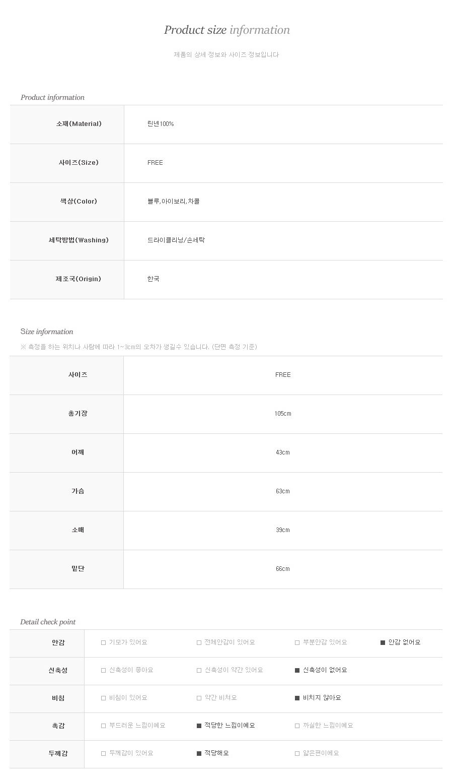 퀄리티 좋은 린넨 100% 소재를 사용하여 통기성 좋구요